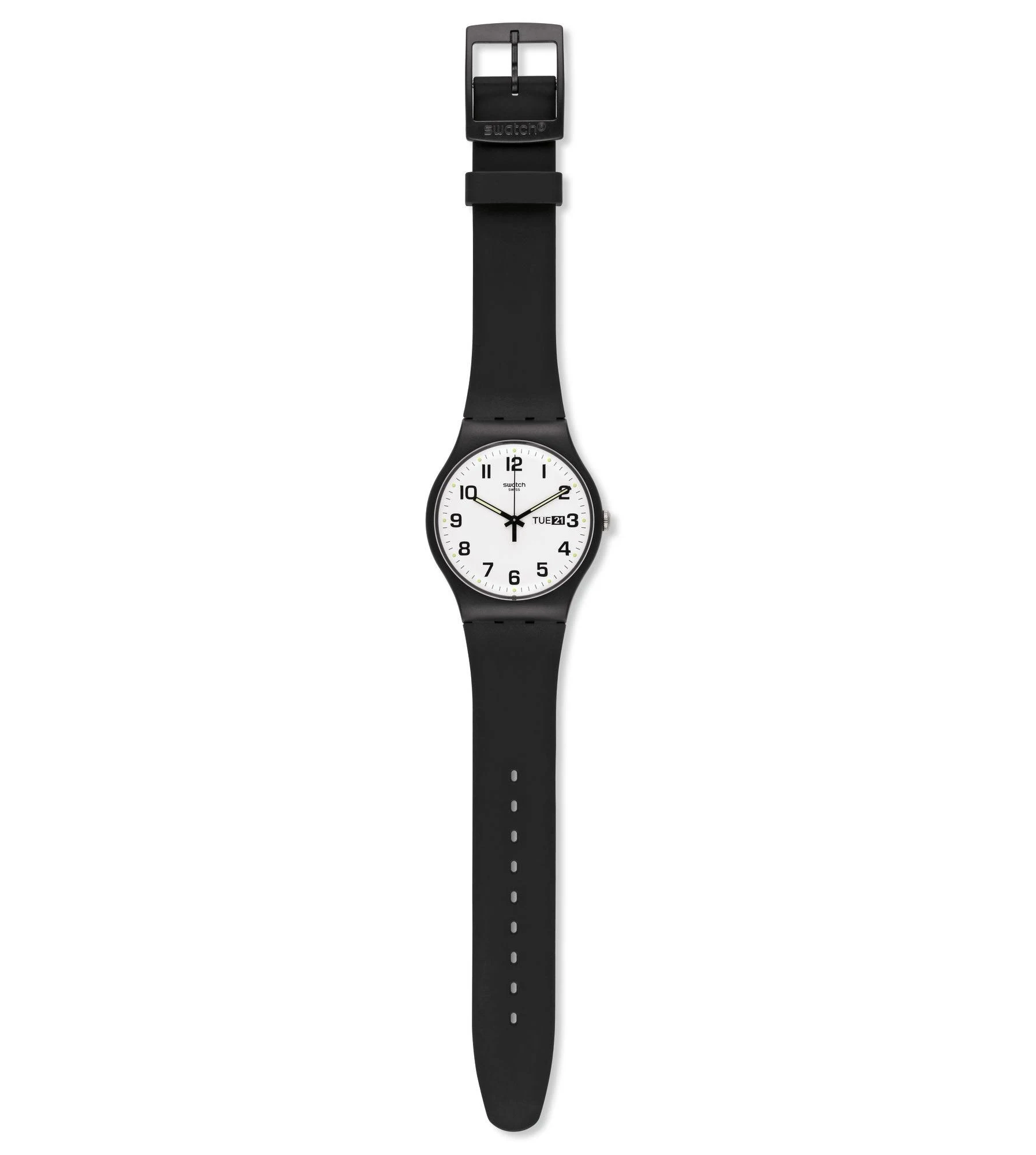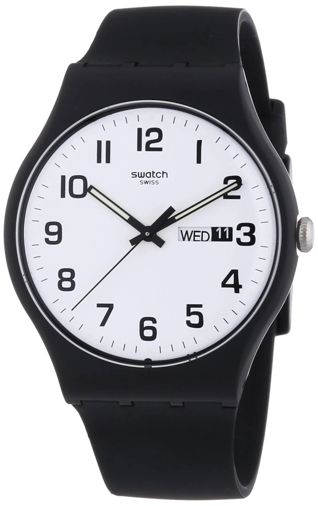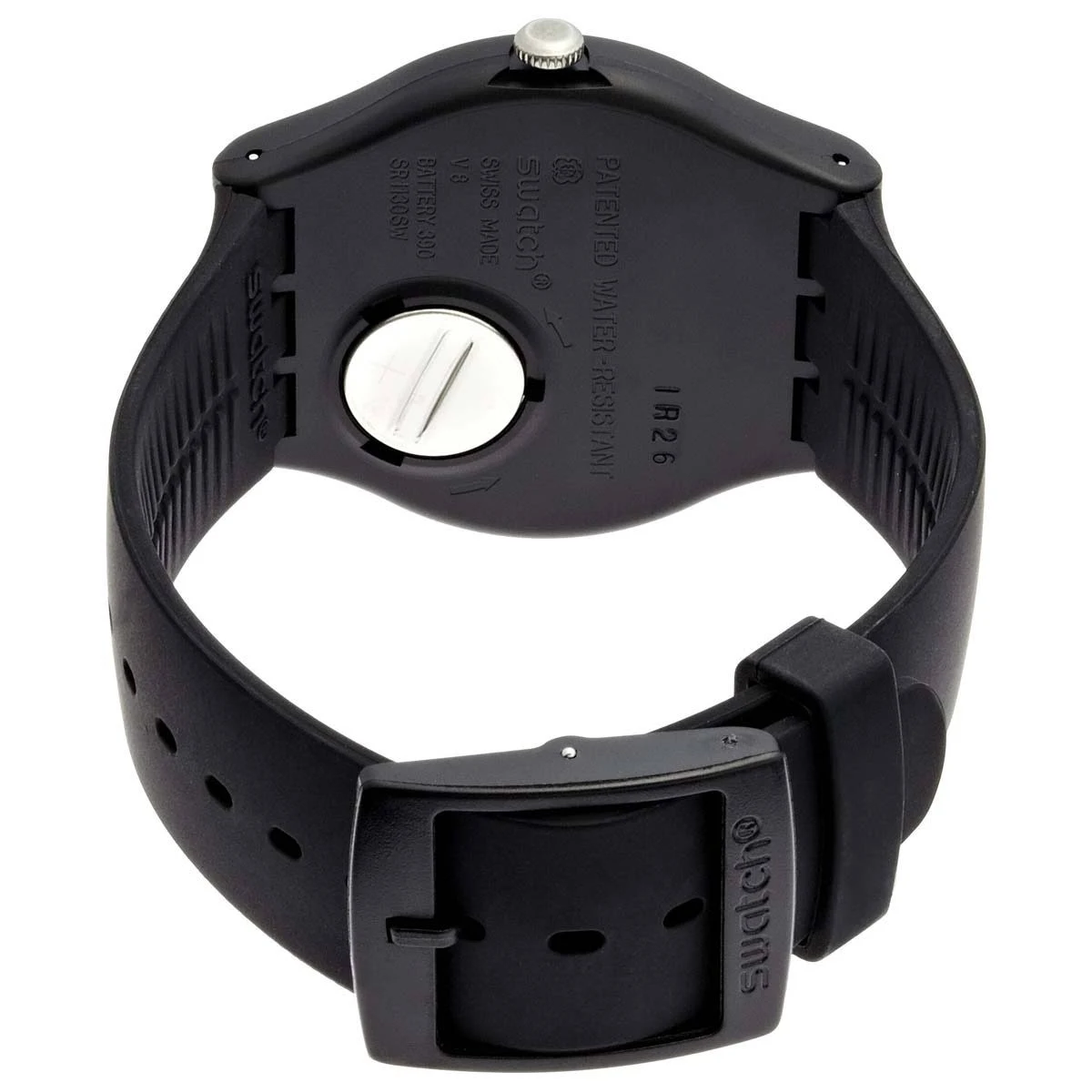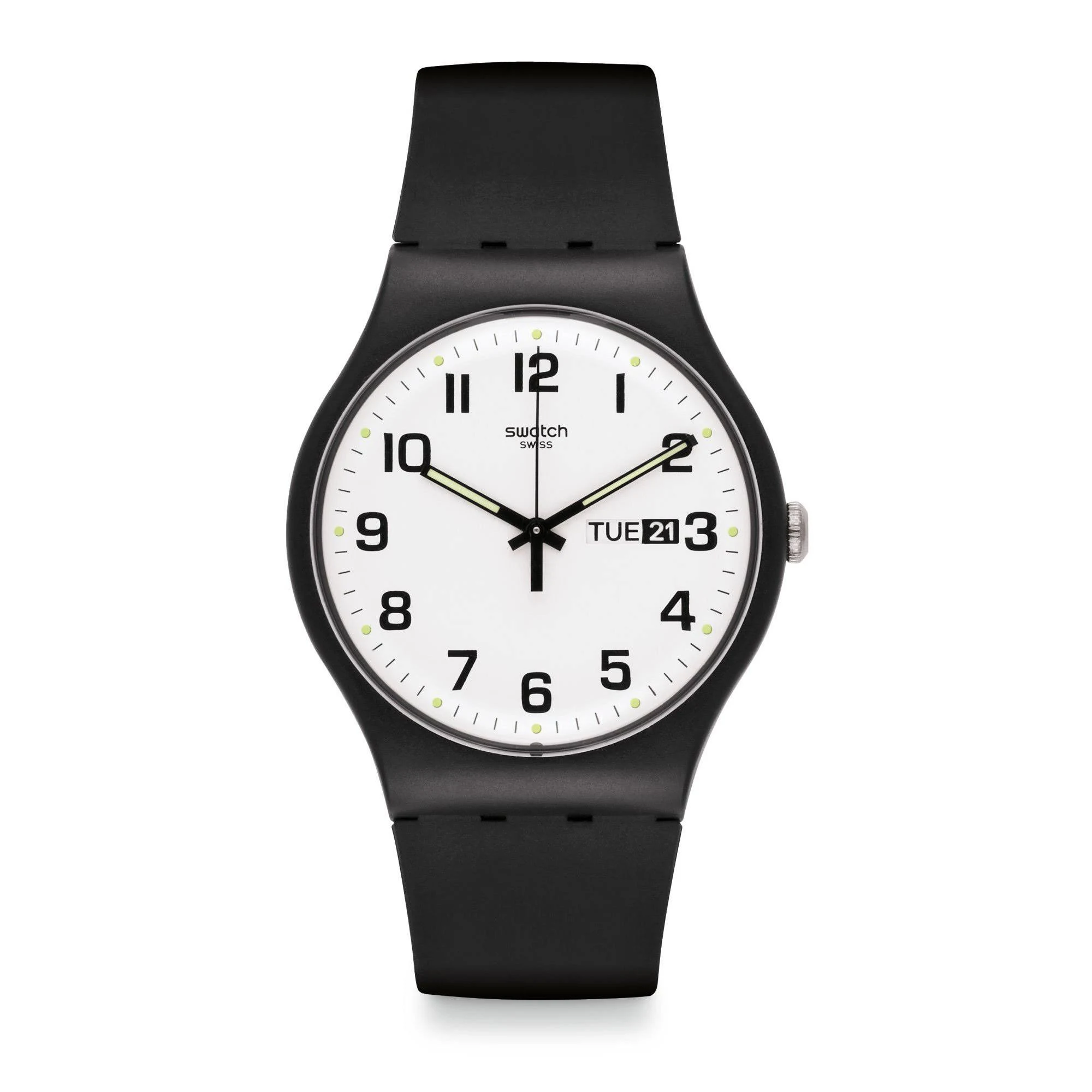 Swatch Twice Again Unisex Watch - SUOB705 From the brand's Originals line of timepieces, the Swatch Twice Again unisex watch is inspired by the previous Swatch Once Again (GB743) watch. This analog quartz movement watch makes a subtle statement and features a simple yet modern design with a 43mm black plastic case, black silicone band and white dial with black numeric markers. Glow in the dark hands that makes it visible in low light and complete darkness. Its comfortable silicone strap, versatile color scheme and simplistic look makes it the perfect everyday "to go" watch for him or her. Water resistant to 100 feet, the Swatch Once Again watch will stand up to light rain splashes, however it is not suitable for showering or swimming.